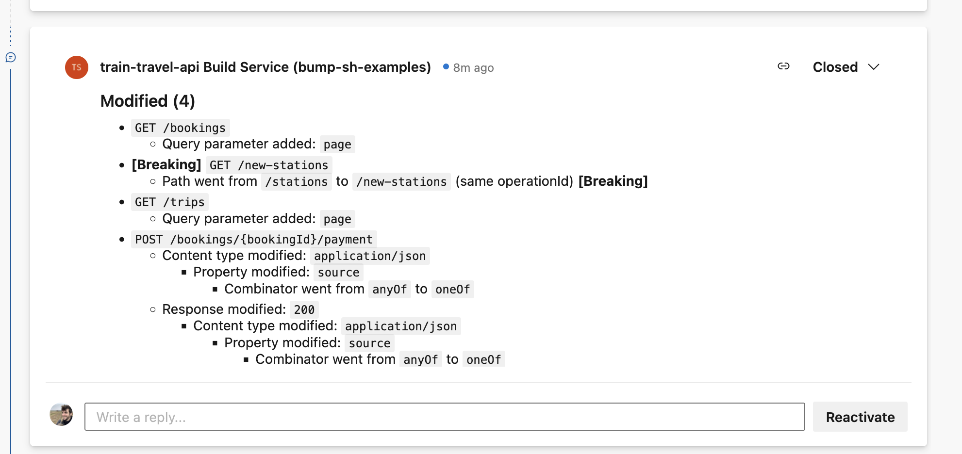 One of the most powerful features in Bump.sh is the automated changelog, and this logic can be used to speed up API Design Reviews by showing people clearly in a single comment what has changed in a pull request. Instead of having to look at lots of YAML, you can see a summary of all meaningful changes added as a comment.