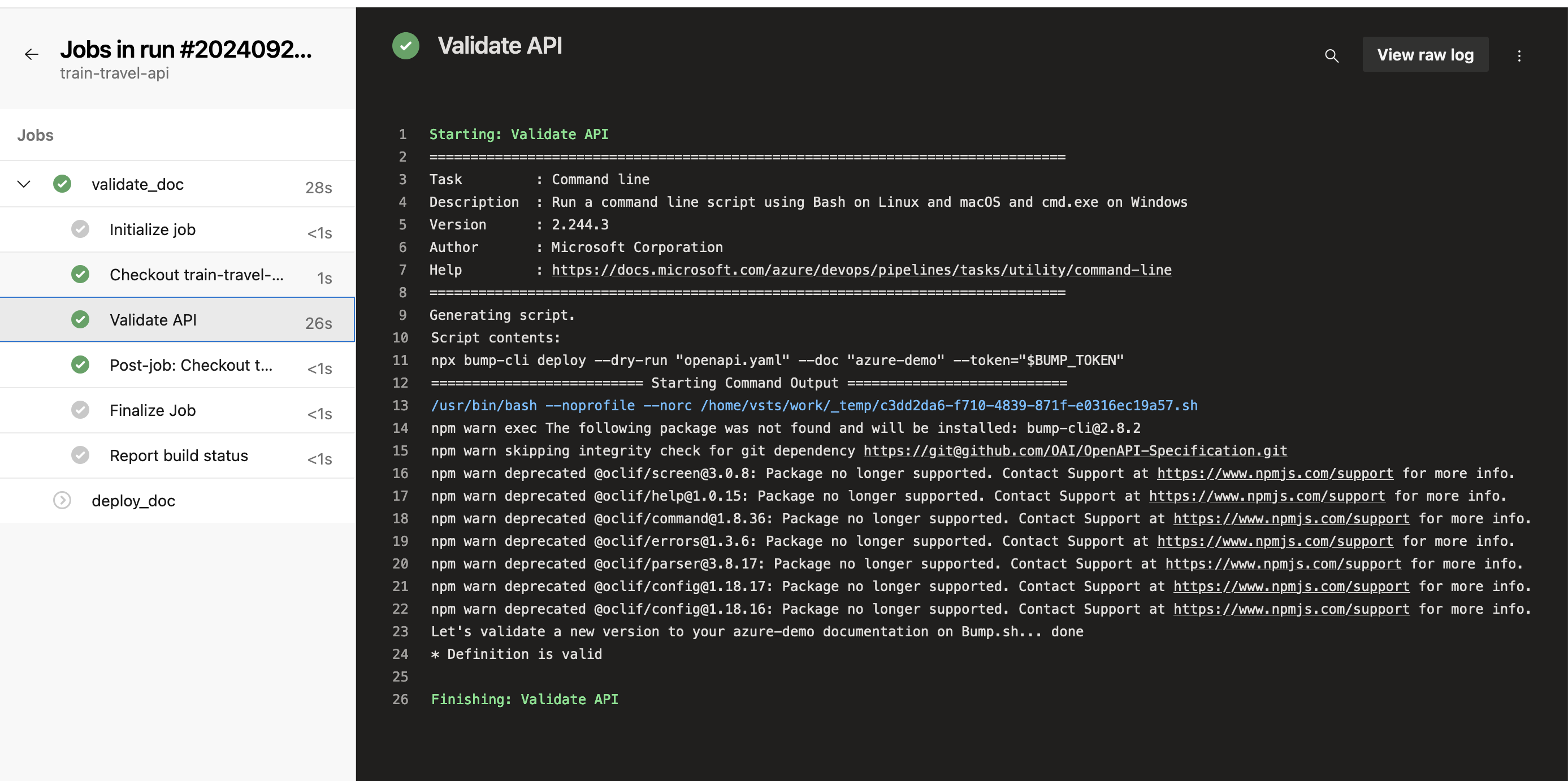 When pushing to a branch other than main, you should see output like this in the Pipelines section of the Azure Devops interface, letting you know if the OpenAPI was valid or not.