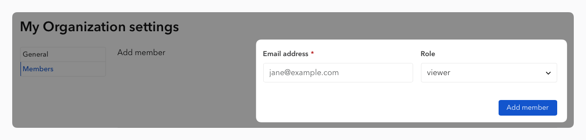 Inviting a colleague or teammate to become a member of your organization can be done from the settings of that organization, by entering the email address in the dedicated form.